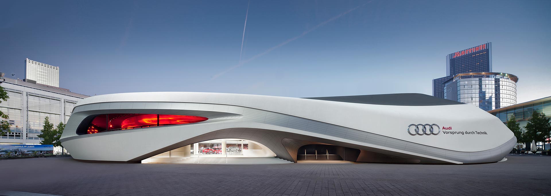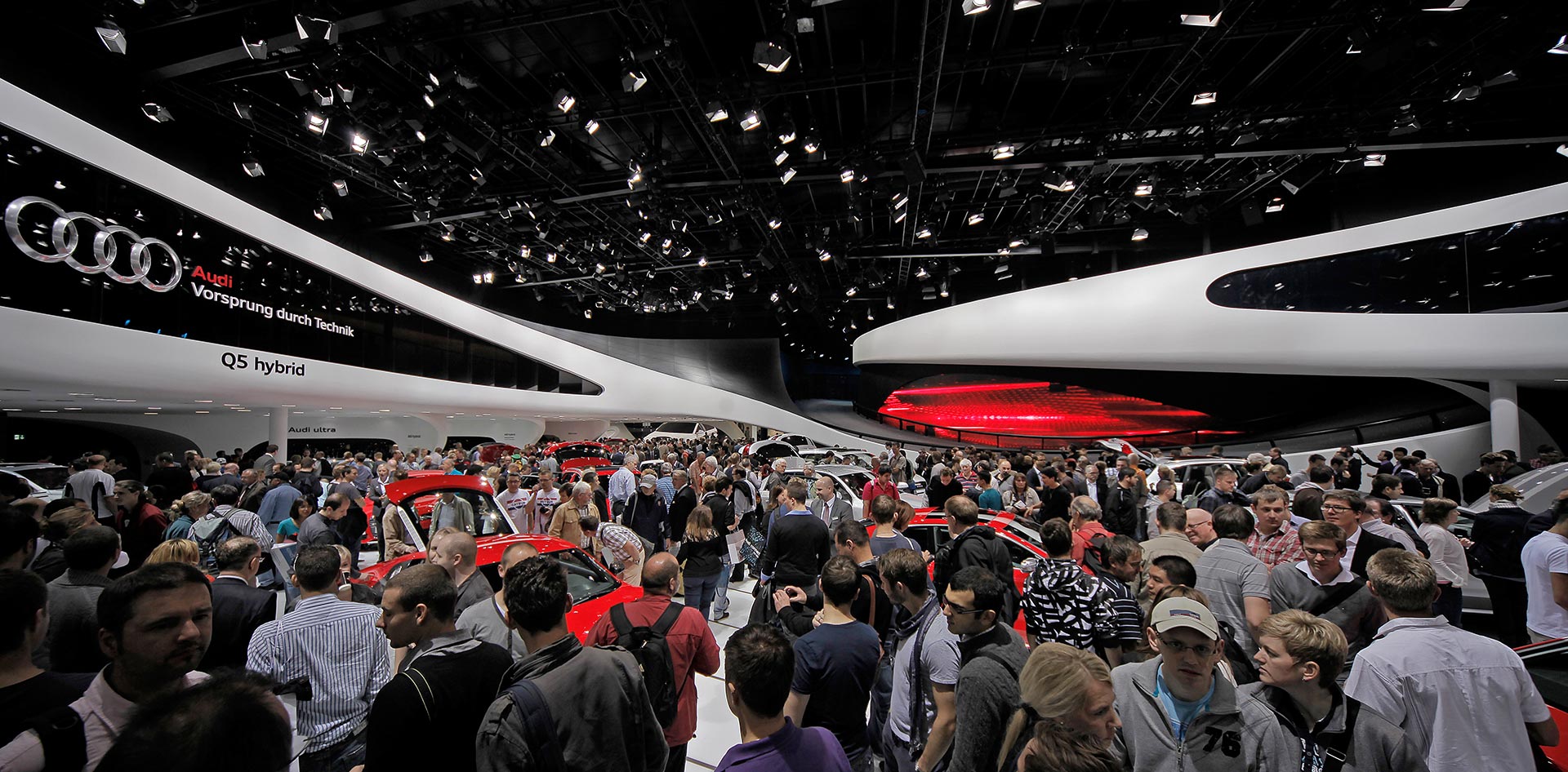 Auf dem zentralen Platz der Frankfurter Messe präsentiert sich Audi erstmals mit einem eigenen freistehenden Gebäude: dem Audi Ring. Herzstück dieses 100 m langen, 70 m breiten und 12 m hohen Messe-Pavillons ist eine integrierte Fahrbahn über zwei Ebenen, auf der bis zu neun Fahrzeuge – durch langgezogene Fassadenöffnungen auch von außen sichtbar – gleichzeitig unterwegs sein werden. Architektur und Kommunikation schaffen mit dem Audi Ring ein unmittelbares, ganzheitliches und damit nachwirkendes Markenerlebnis.