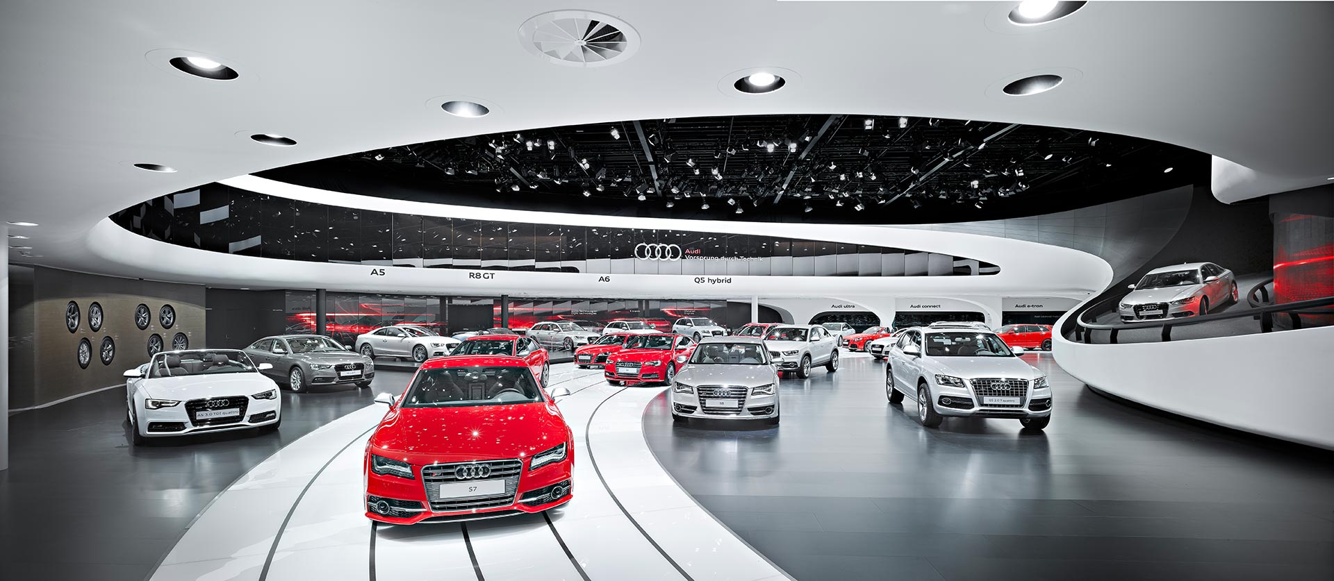 Der Besucher-Rundgang beginnt in der »Grand Hall«, wo die gesamte Bandbreite der neuesten Audi-Modelle präsentiert wird.