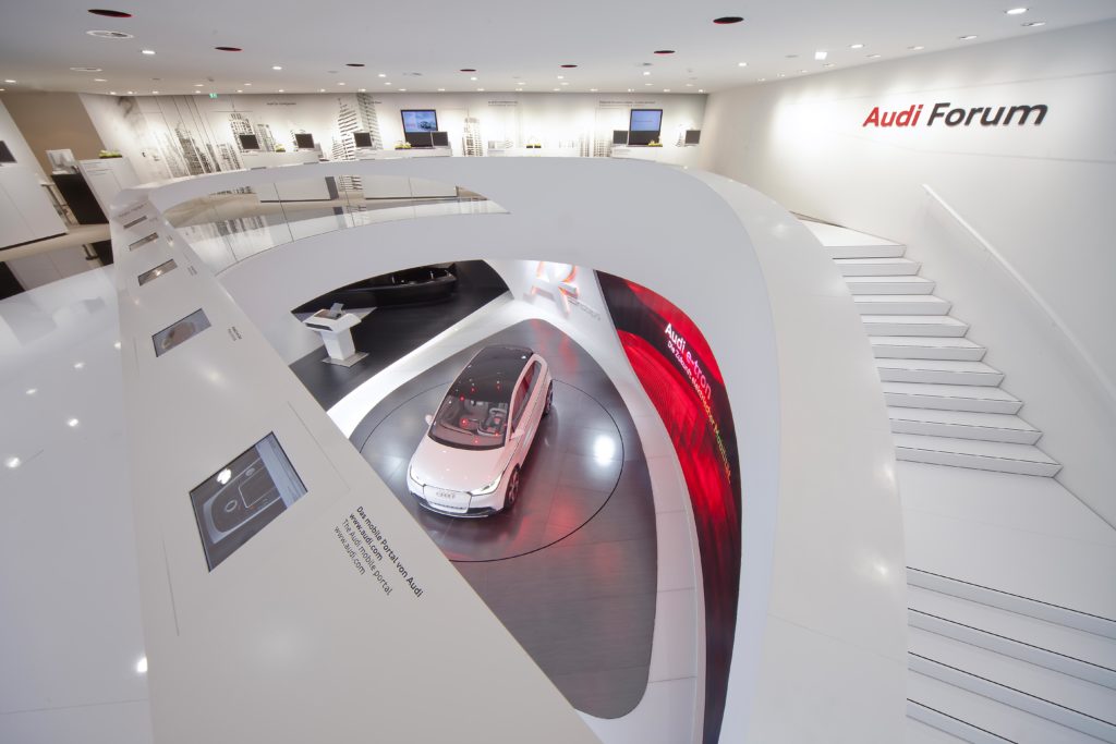 Drei Höhepunkte bilden den Abschluss des Besuchs: Die Inszenierung der Showcars Audi A2 concept, Audi urban concept und die multimediale Markenshow, in der reale und virtuelle Elemente, Raumdramaturgie und Kommunikation in ungewöhnlicher Inszenierung verschmelzen. Architektur und Kommunikation schaffen mit dem Audi Ring ein unmittelbares, ganzheitliches und damit nachwirkendes Markenerlebnis.