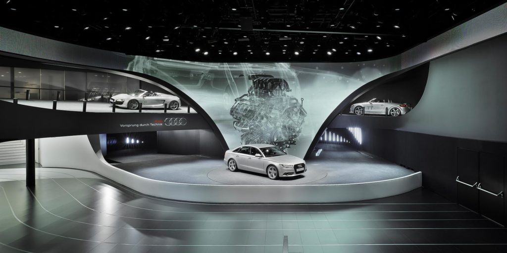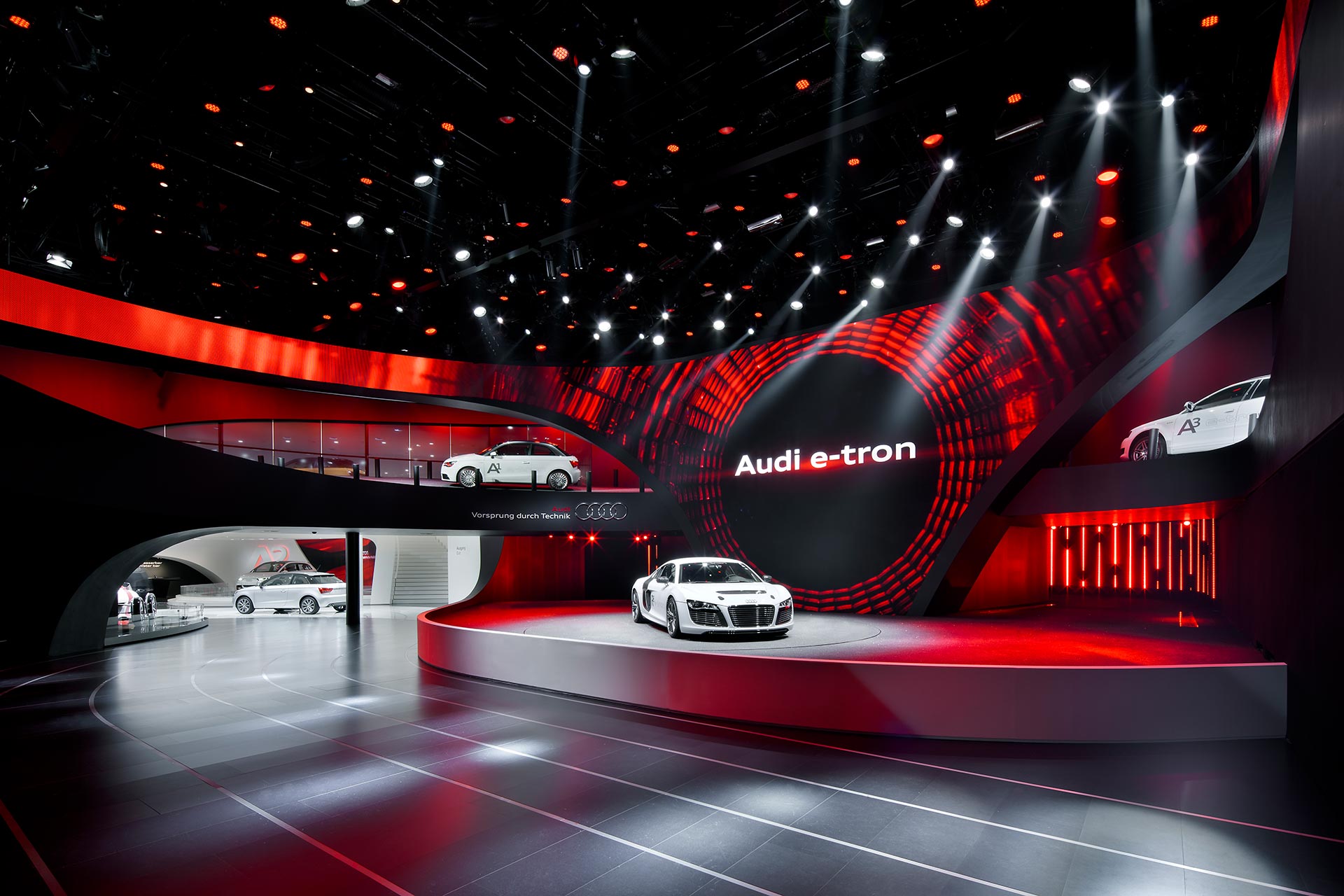 Raumkonzept und Inszenierung vermitteln Dynamik, Innovation und Hochwertigkeit: Bewegung und Progression sind an jeder Stelle des Gebäudes ablesbar. Die von fließenden Formen, gekurvten Linien und überraschenden Übergängen geprägte Architektur bindet Fassadenkonturen, Ein- und Durchgänge in ein übergreifendes Konzept ein, das zusammen mit der multimedialen Bespielung und den interaktiven Exponaten den Markenkern »Vorsprung durch Technik« und die zukunftsorientierte Positionierung von Audi erlebbar macht. Aufbauend auf die langjährige Zusammenarbeit setzt der Audi Ring als Ergebnis einer konsequenten Evolution die vorangegangenen Messeauftritte schlüssig fort.