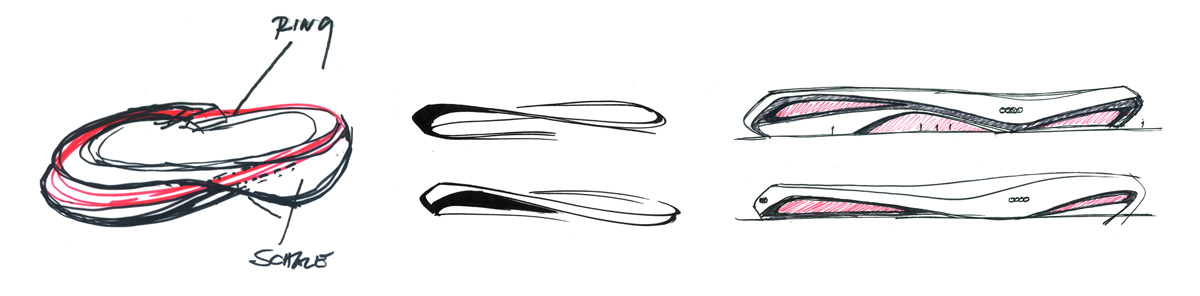 ”Die Idee der Bewegung von Besuchern, Fahrzeugen und der Ausstellung verschmilzt zum Audi Ring. Der Audi Ring stellt die architektonische, räumliche Übersetzung der Audi Markenwerte ›sportlich, progressiv, hochwertig‹ dar. Aufbauend auf die langjährige Zusammenarbeit und konsequente Beschäftigung mit der Marke ist der Audi Ring in seiner Komplexität und Größe ein Höhepunkt und Ergebnis einer steten Evolution.“