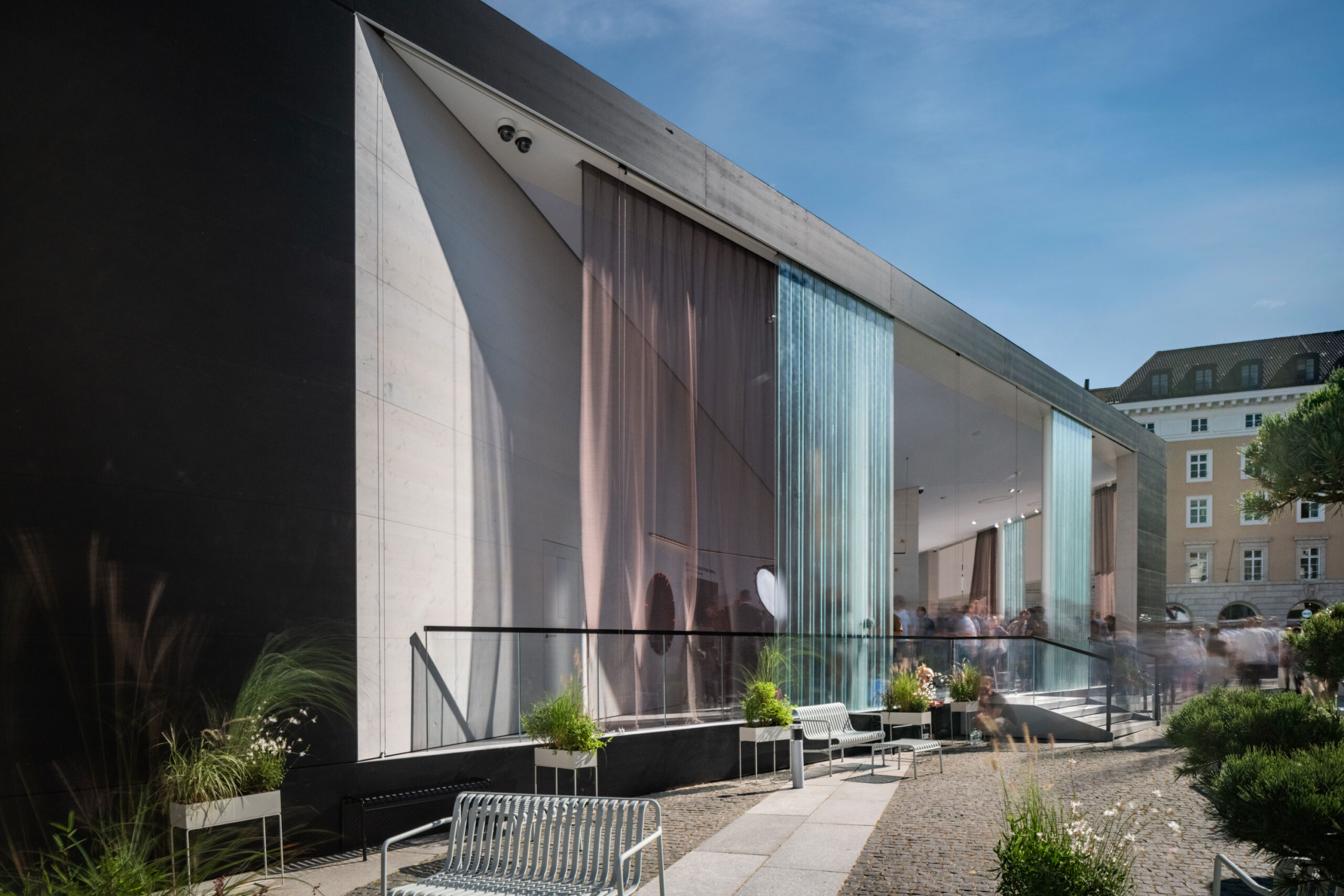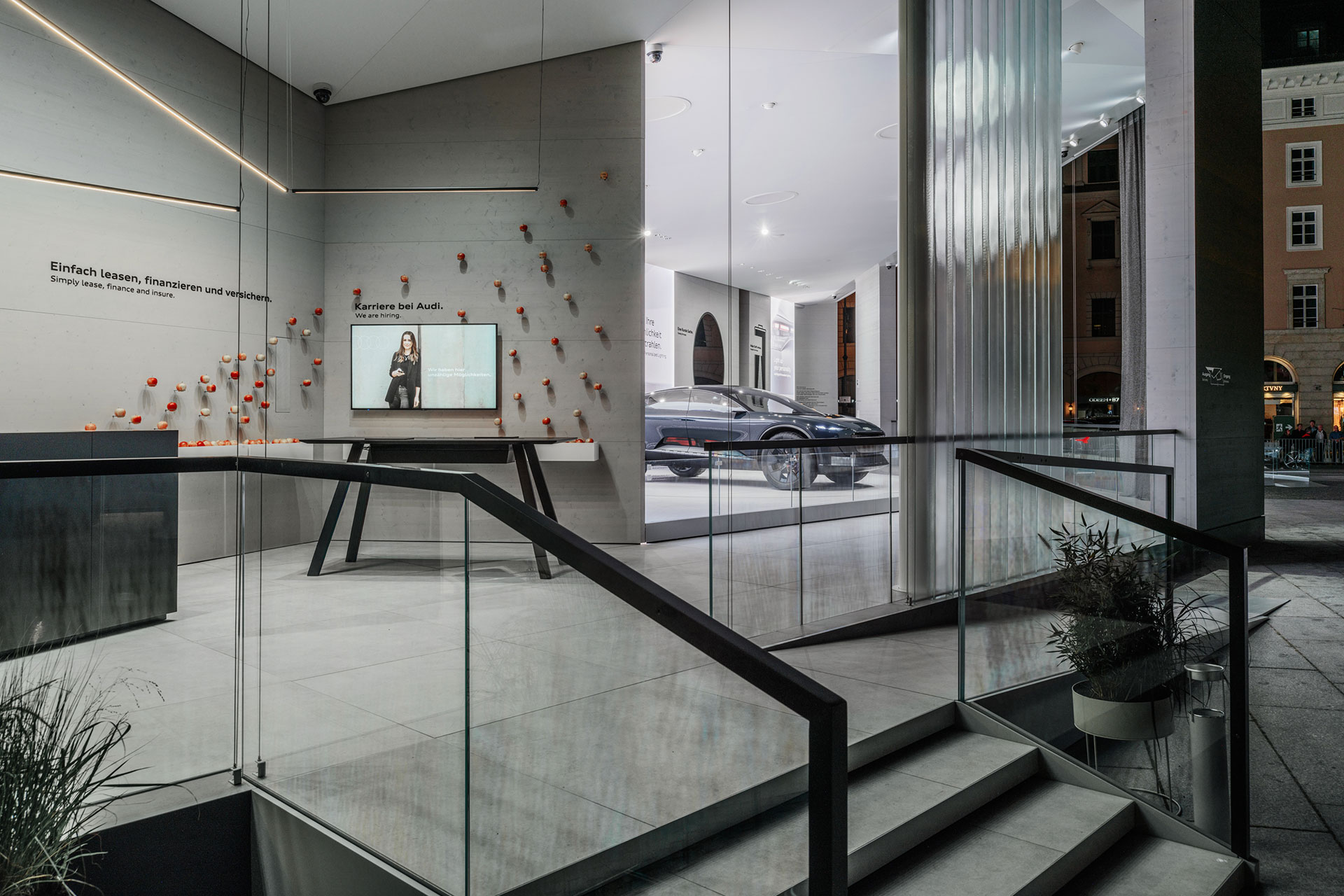 Die Gestaltung des Markenauftritts von Audi auf der IAA Mobility 2023 zeichnet sich durch eine offene Architektur aus, die eine kommunikative Atmosphäre schafft und zum Diskurs einlädt. Bereits vor dem Gebäude werden die Besucher:innen von einem Lineup von elektrischen Fahrzeugen empfangen. Übergehend in den Pavillon empfängt ein haltungsstarkes Manifest die Besucher:innen beim Eintritt in die Markenwelt. Die Ausstellung im vorderen Bereich nutzt großformatige LED-Welten, um mit visueller Kommunikation die aktuellen Audi Inhalte zu präsentieren. Hier sind Maßnahmen des innovativen Unternehmens in Bezug auf Nachhaltigkeit und Change sichtbar.