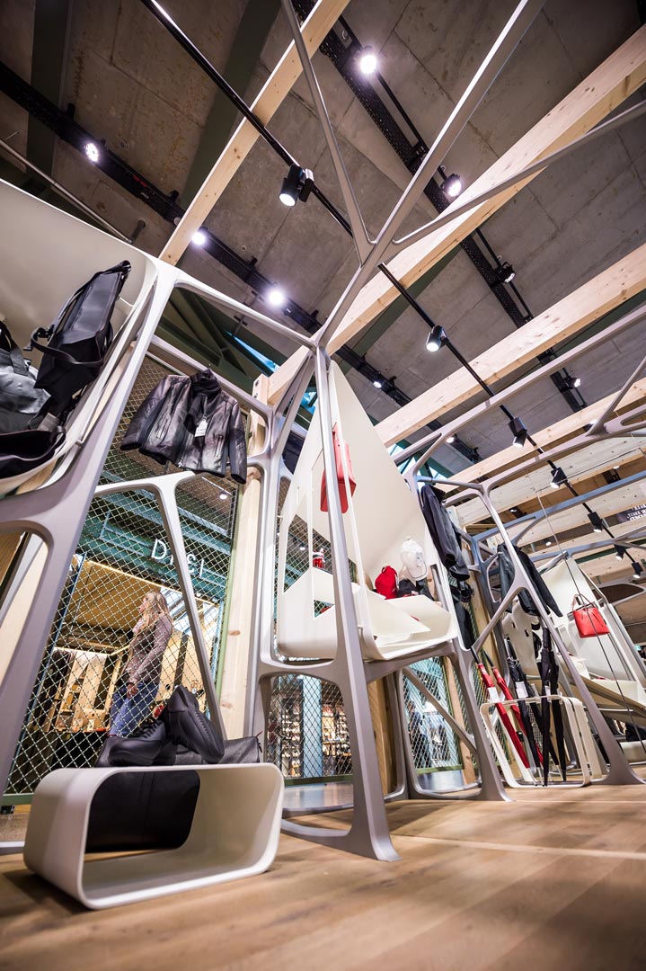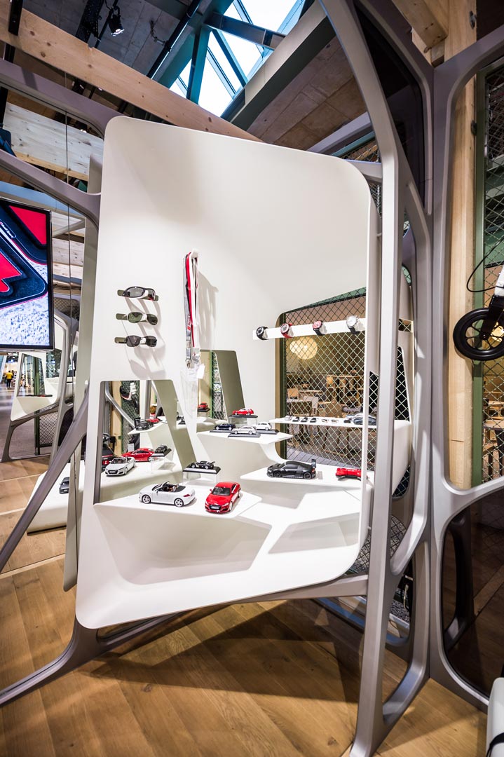 In der organisch vernetzten Leichtbau Skulptur präsentieren die eingehängten Solid Structures aus pulverbeschichteten Alublechen die Audi Sport Collection.