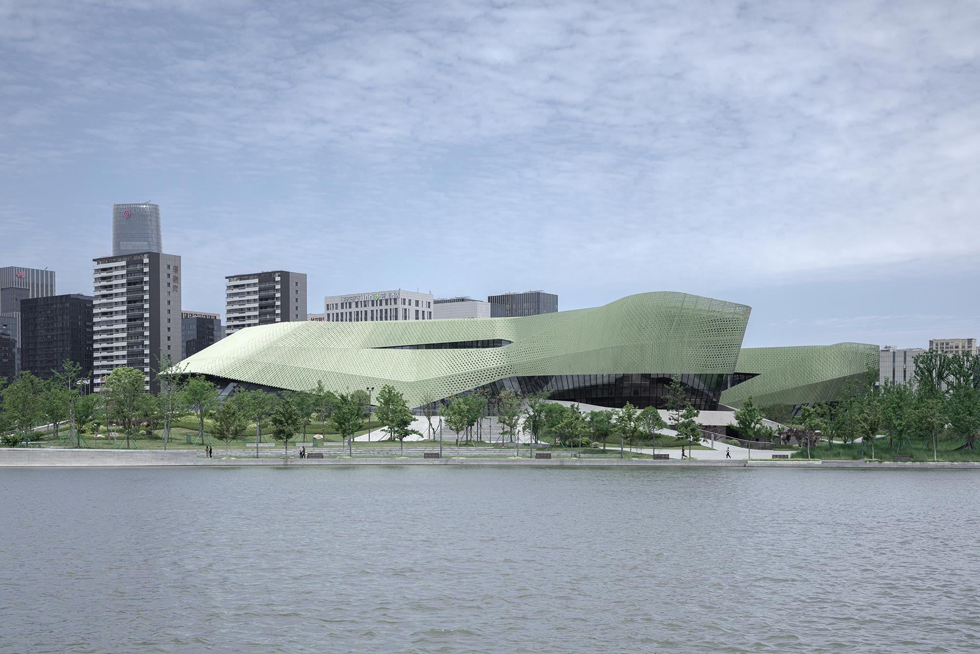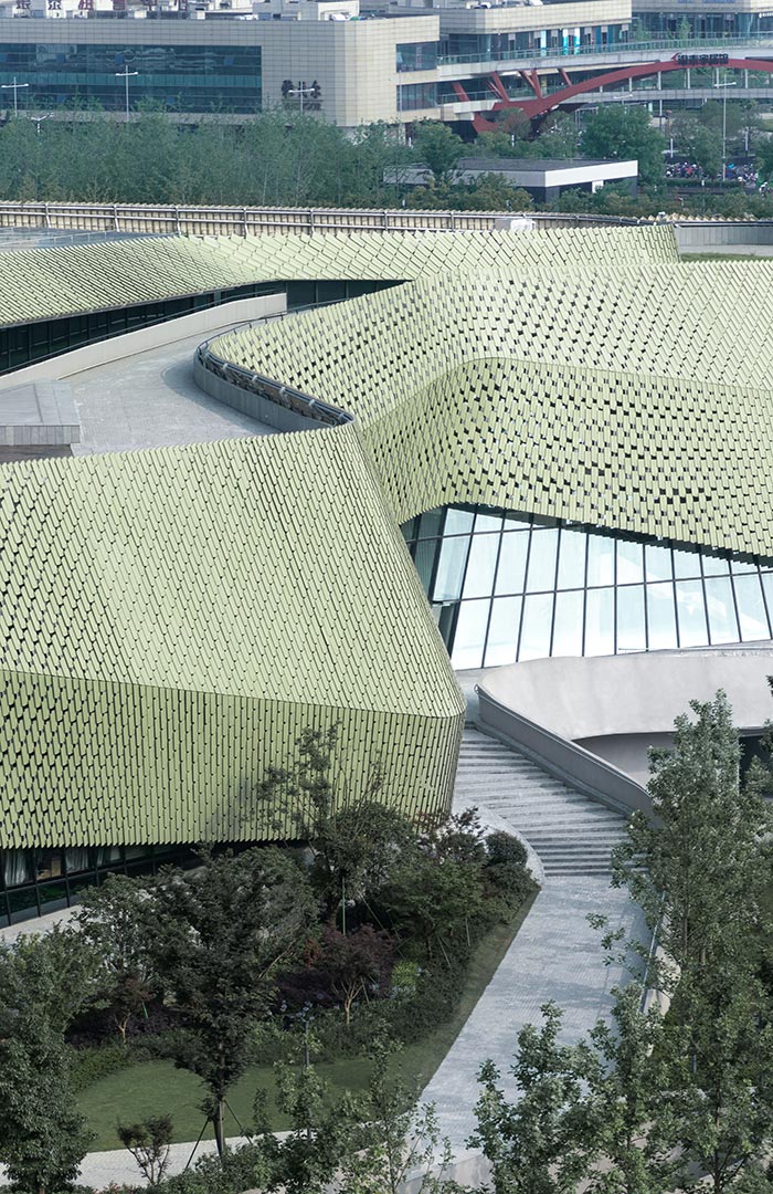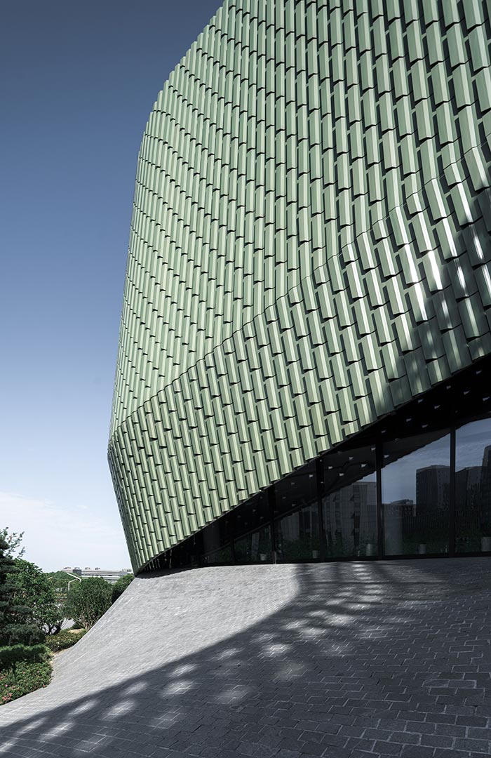 The City of Ningbo has a rich history in ceramic production. It was here that the so-called Ceramic Road began, and the city played an important role in the national and international trade of ceramics throughout the civilization’s history. That said, the use of ceramics is not simply an homage to the local traditions of Ningbo; the building’s textured glazedceramics also create ephemeral reflections of surrounding cityscape. These reflections animate the facade with varying intensity depending on time of day, season, weather, etc.