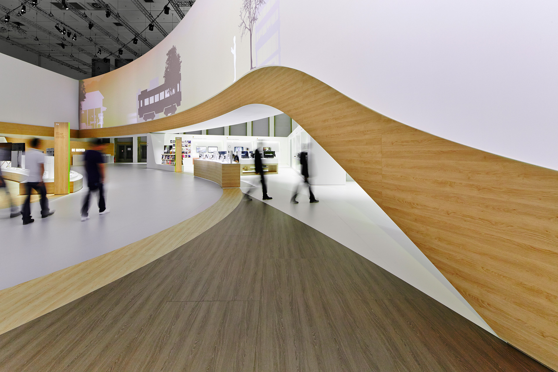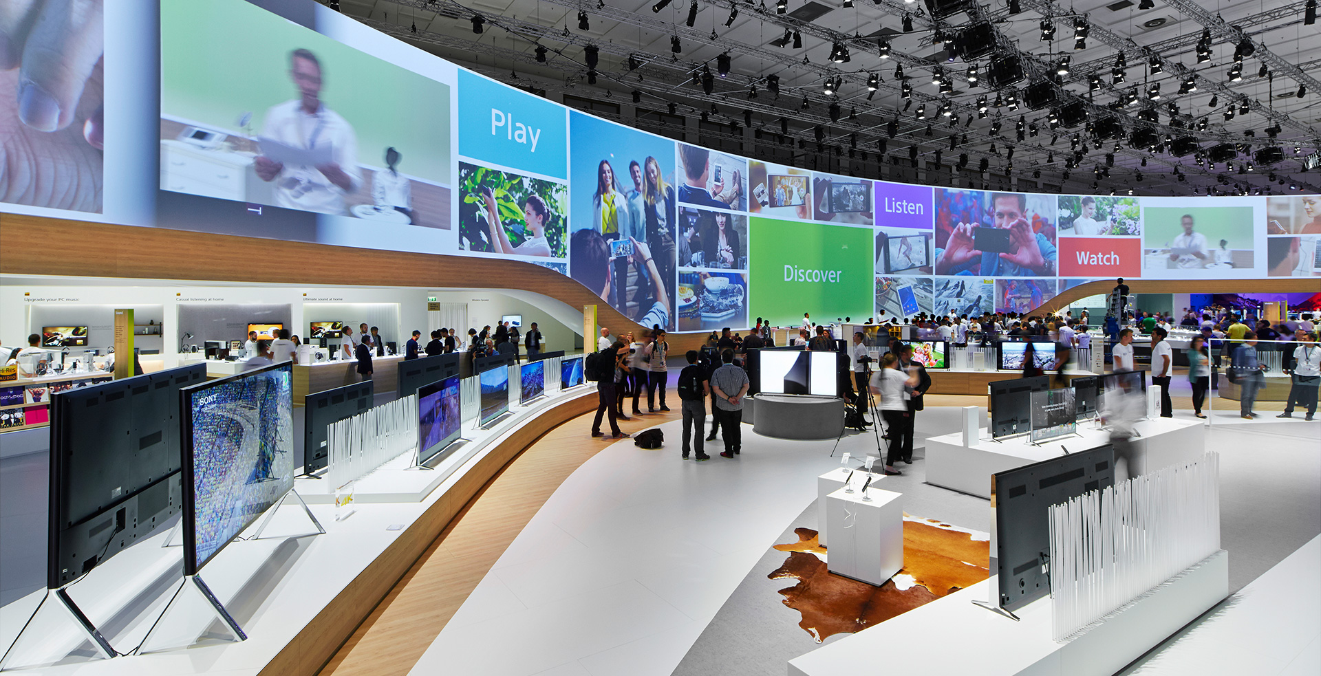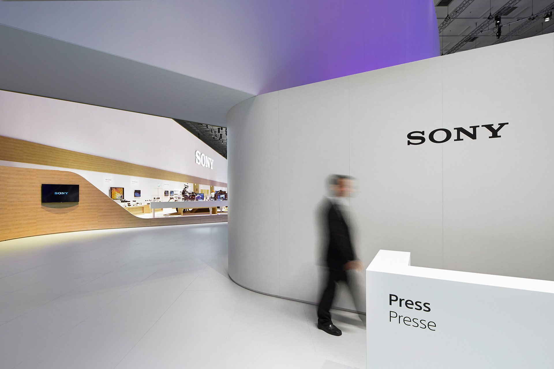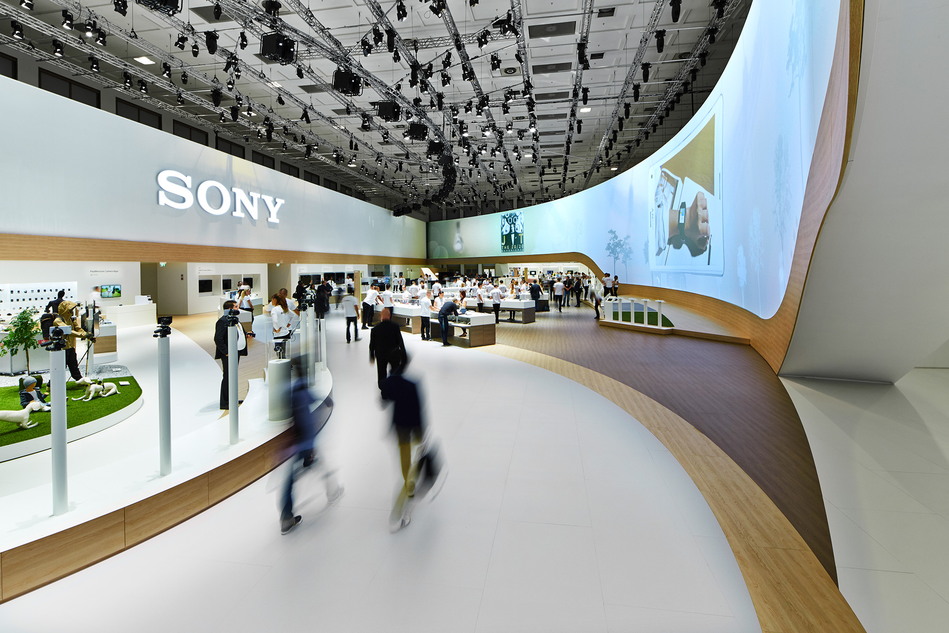 The individual product areas seamlessly overlie the adjoining Activity Zones and show the close interplay between gadgets and appliances. Warm surfaces made of wood and textile break up the harsh white spaces of the previous year, trails on the floors and walls beam the changing display of colours from the SONY Interface Design into the room.