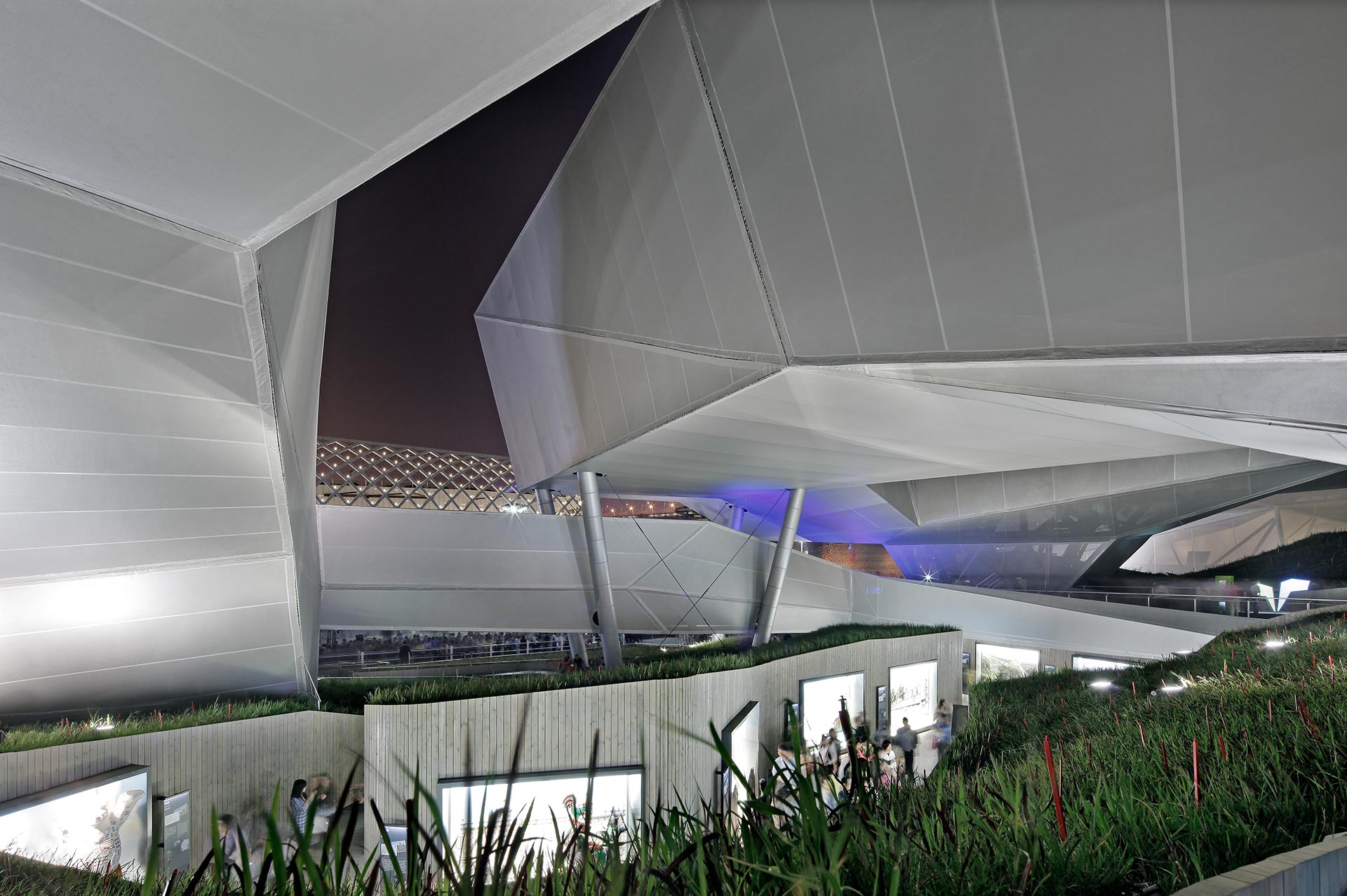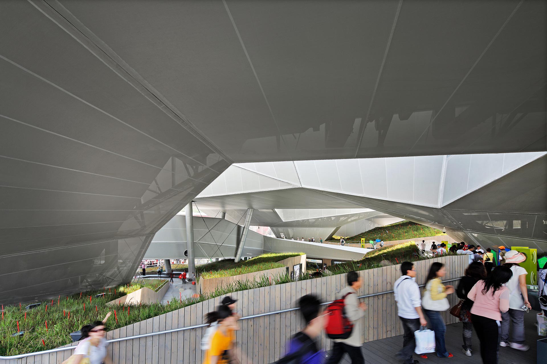 Ausladende polygonale Baukörper bilden schwebende Ausstellungsräume und Landschaften, die sich mit dem Innen verschränken. Sie legen einzelne „Erdschichten“ frei und zeigen in Form von Dünnschicht-Solarzellen neue Energieträger. Die Fassade des Deutschen Pavillons ist mit einer transparenten Textilhaut bespannt. Das silbern glänzende Gewebe unterstützt die Klimatisierung, spendet Schatten und reflektiert die Sonneneinstrahlung bis zu 80 Prozent. Die Architektur integriert innovative und intelligente Materialien, die viele Funktionen übernehmen können und Gebäude nachhaltiger machen.