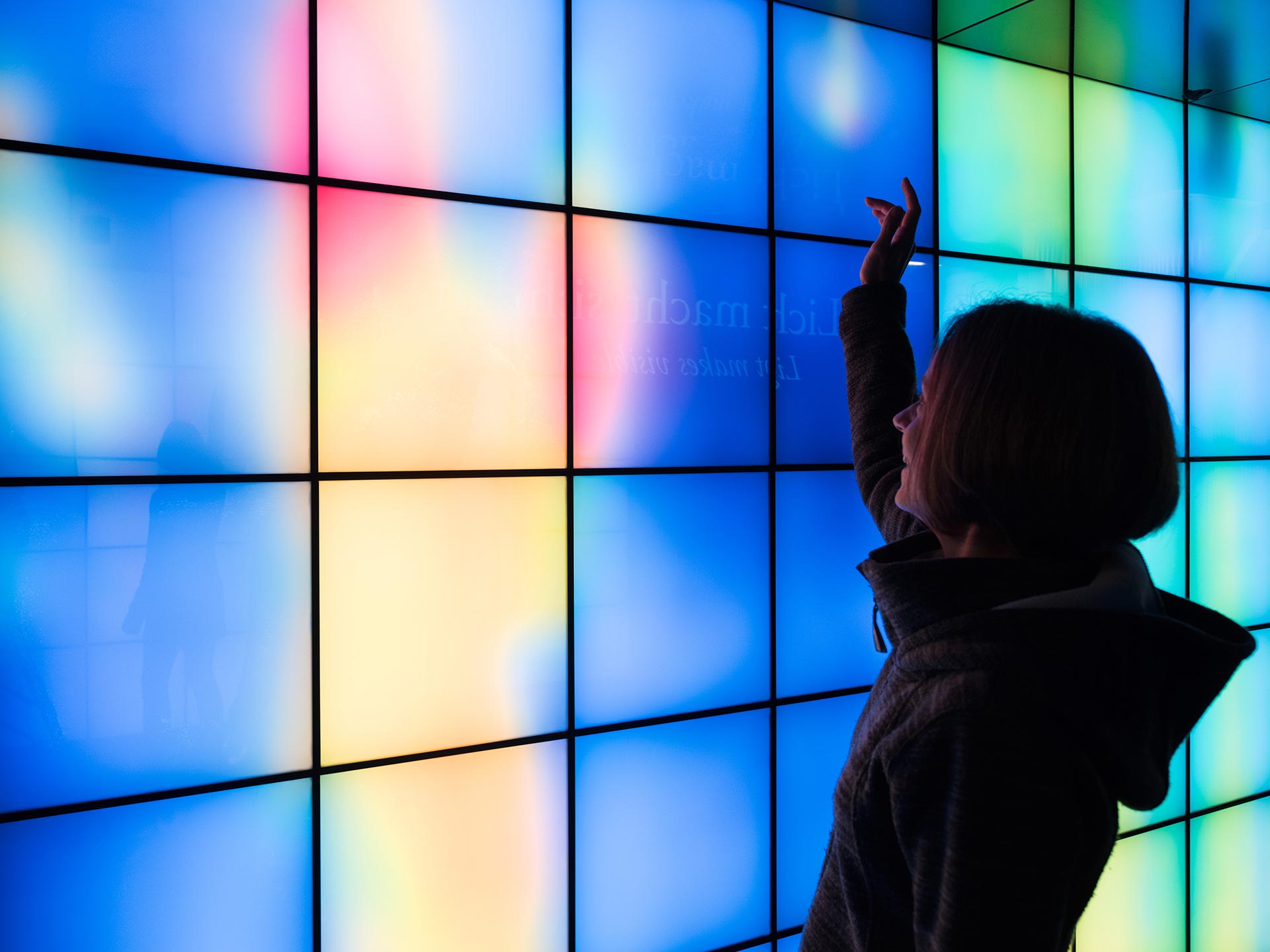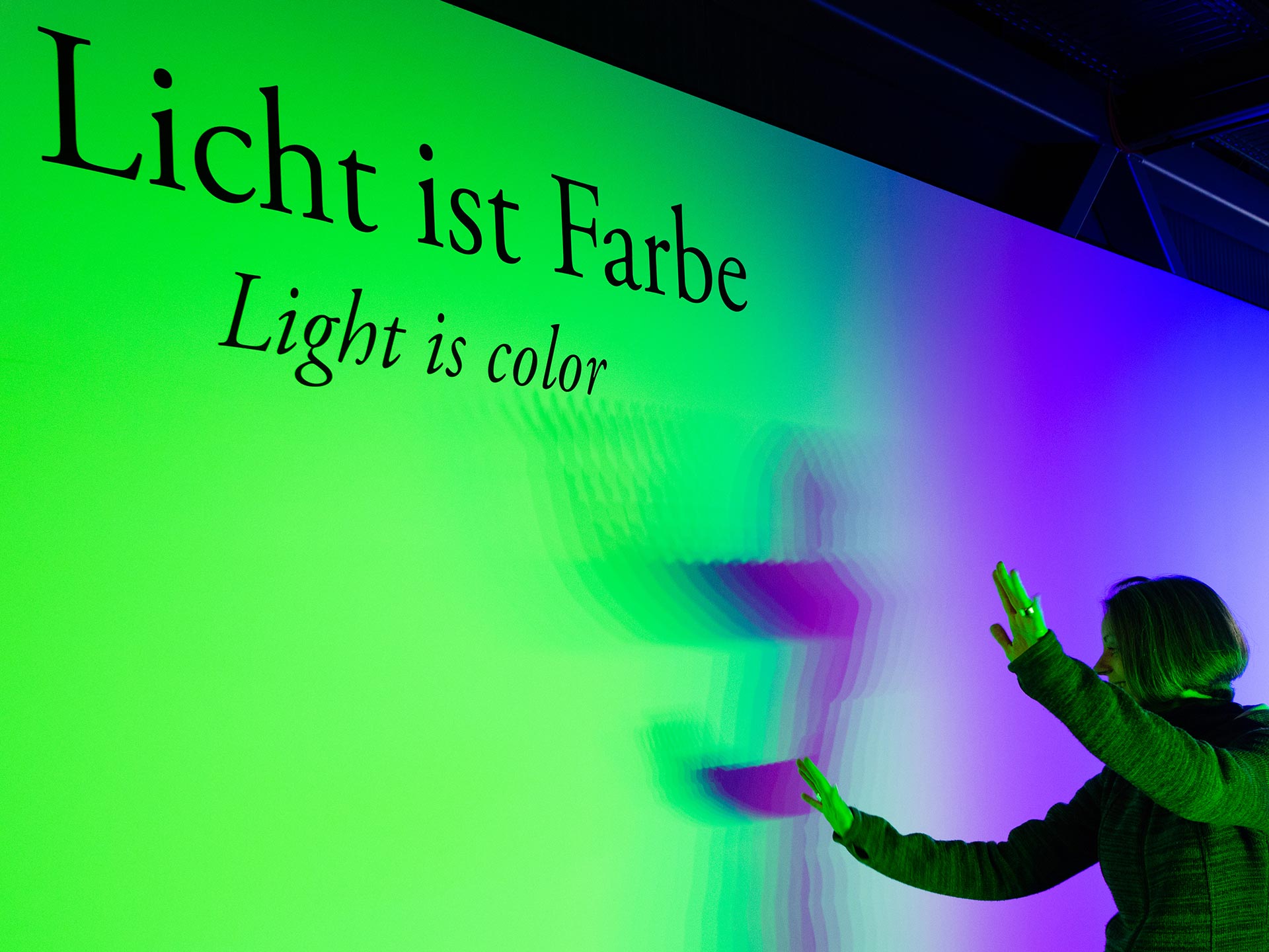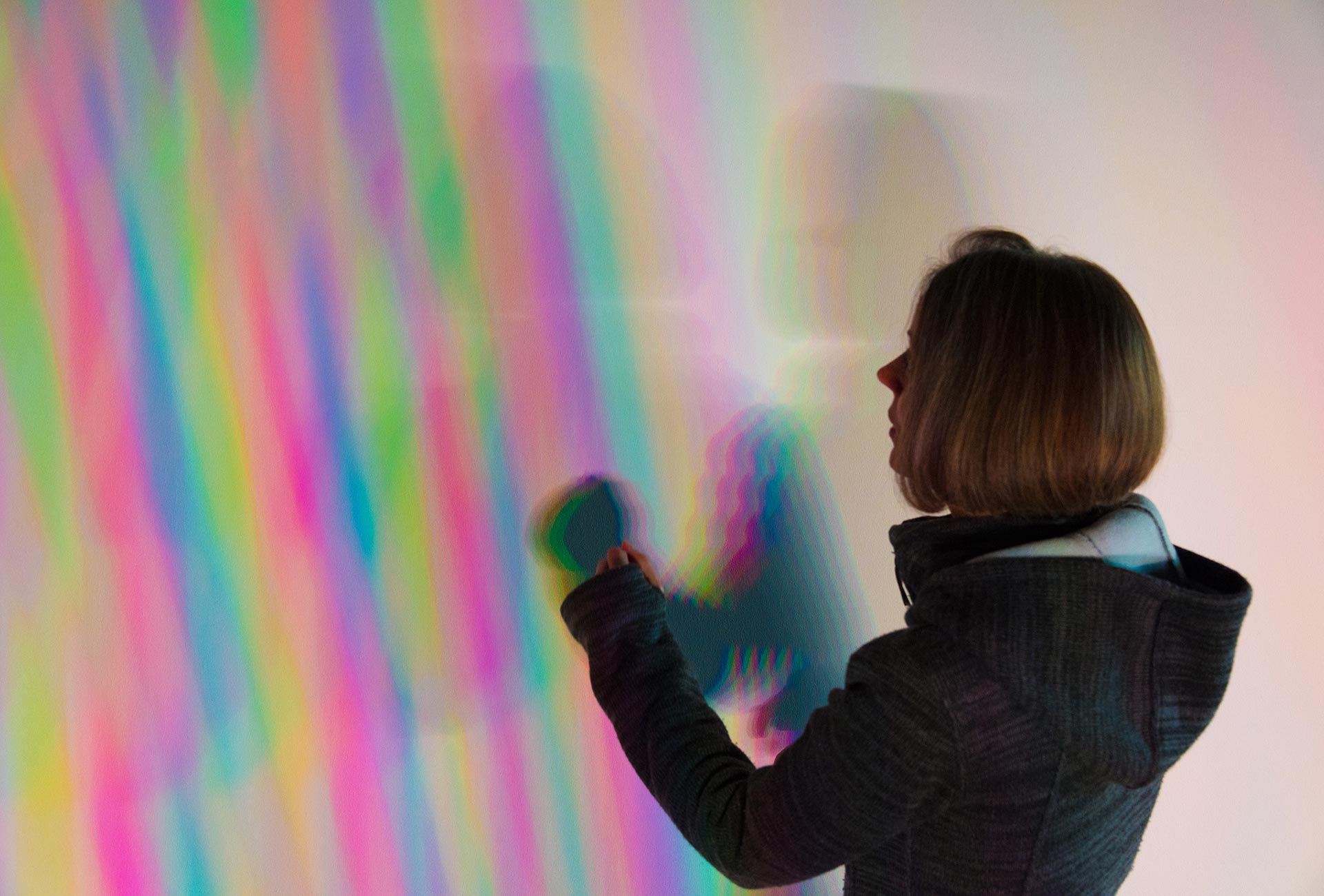 Mit ihren Schatten decken Besucher die Weißlichtbestandteile Rot, Grün und Blau teilweise oder ganz ab und machen so die jeweiligen Sekundär- oder auch Komplementärfarben sichtbar.