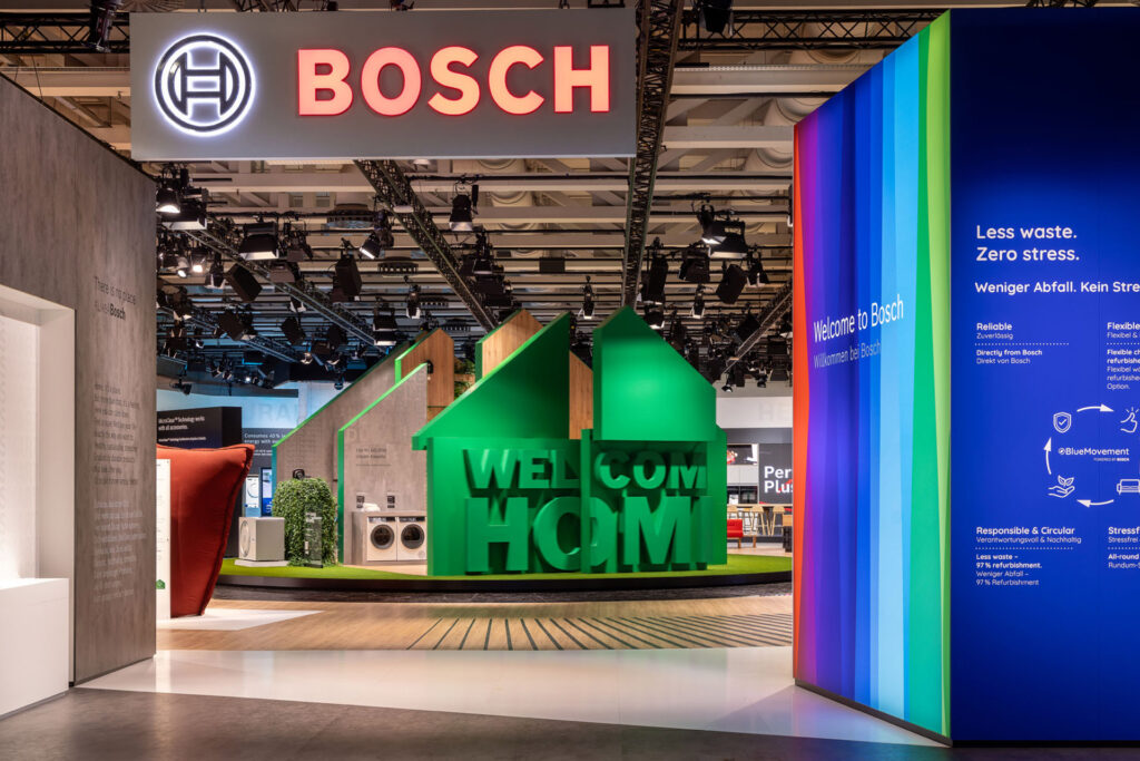 Perfekt inszeniert im zentralen, sich drehenden Icon und den angrenzenden Produktbereichen stehen die fünf Metathemen Sustainability, Health, Protection, Durability und Stress-Free Living im Mittelpunkt. Die Besucher:innen können die gesamte Bosch Produktvielfalt live erleben und die Markenidentität hautnah erleben.